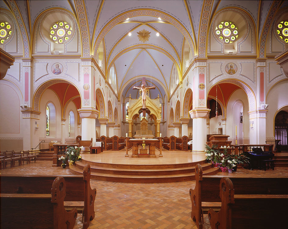 The master renovations plan for this historic church included installation of new mechanical and electrical systems, replacement of the nave floor, redesign of the altar platform, relocation of the monastic choir to better accommodate the liturgy of the hours, and the creation of a Blessed Sacrament Chapel. The interior decorative stenciling was also restored as a part of this project.